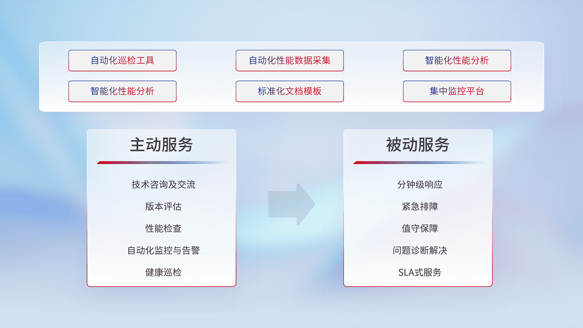 智能化工具和标准化文档,,保障服务质量,,,,提供主动服务(包含技术咨询、、、、版本评估、、、性能检查、、、、自动化监控与告警、、、健康巡检)和被动服务包含(分钟级响应、、、、紧急排障、、、、值守保障、、问题诊断解决、、SLA服务)。。